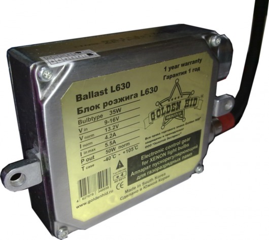 Блок розжига Golden HID L630 — модель разжигателя ксеноновой лампы с обманкой бортового компьютера и мощностью 50 Ватт. Главные преимущества этого балласта в том, что он быстрее разжигает лампу, а лампа, в свою очередь, светит ярче, чем с другими разжигателями.