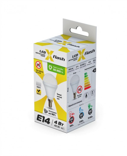 Светодиодная лампа X-Flash MINI E14 4W оптимально подходит для всех типов светильников, которые рассчитаны на лампы накаливания с таким цоколем. Колба модели матовая и имеет шаровидную форму. Алюминиевый радиатор led лампы способствует понижению температуры внутри нее, тем самым увеличивается срок службы. Данная модель рассчитана на напряжение 220 В. Мощность диодной лампы X-Flash — 4 Вт., яркость — 420 Лм, а температура свечения – 4000 K (это нейтральный белый свет).