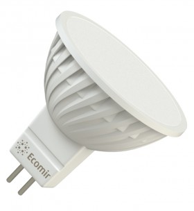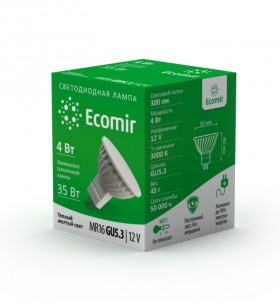 Светодиодная лампа Ecomir GU5.3 4W эквивалентна галогеновой лампе мощностью 35 Вт с цоколем MR16. Потребляемая мощность – всего 4 Вт, цветовая температура – 3000 К (это желтый свет). Световой поток — 300 лм. Напряжение — 12 В. Матовый рассеиватель. Угол освещения > 90°.