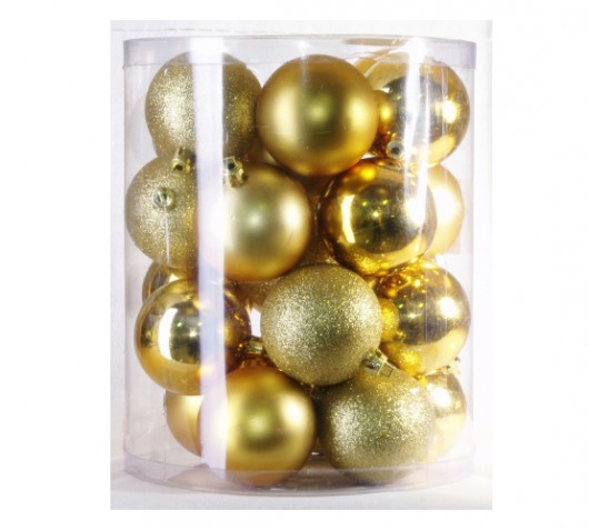 В набор PeneriGifts входит 24 пластиковых елочных шара диаметром 6 см. Этого более чем достаточно, чтобы целиком нарядить любую домашнюю ель. Даже не обязательно добавлять мишуру — любая елка и без нее будет выглядеть элегантно и самодостаточно. Сочетание матовых, глянцевых и переливающихся золотистых шариков с блестками смотрится ярко, нарядно и гармонично.