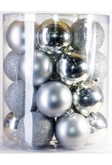 В набор PeneriGifts входит 24 пластиковых елочных шара диаметром 6 см. Этого более чем достаточно, чтобы целиком нарядить любую домашнюю ель. Даже не обязательно добавлять мишуру — любая елка и без нее будет выглядеть элегантно и самодостаточно. Сочетание матовых, глянцевых и переливающихся серебристых шариков с блестками смотрится ярко, нарядно и гармонично.