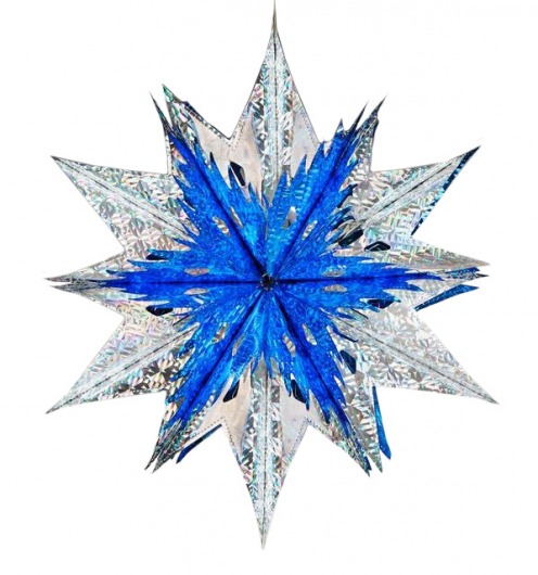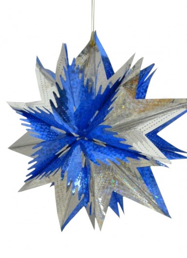 Голографическая сине-серебряная звезда из фольги — прекрасный вариант эффектного и недорогого новогоднего украшения. Новогодняя звезда диаметром 40 см отлично подойдет для украшения уличных елок и просторных помещений. Такая звездочка смотрится очень нарядно, особенно при искусственном свете. А кроме того, она прочная и хорошо хранится, и поэтому будет радовать вас еще много лет.