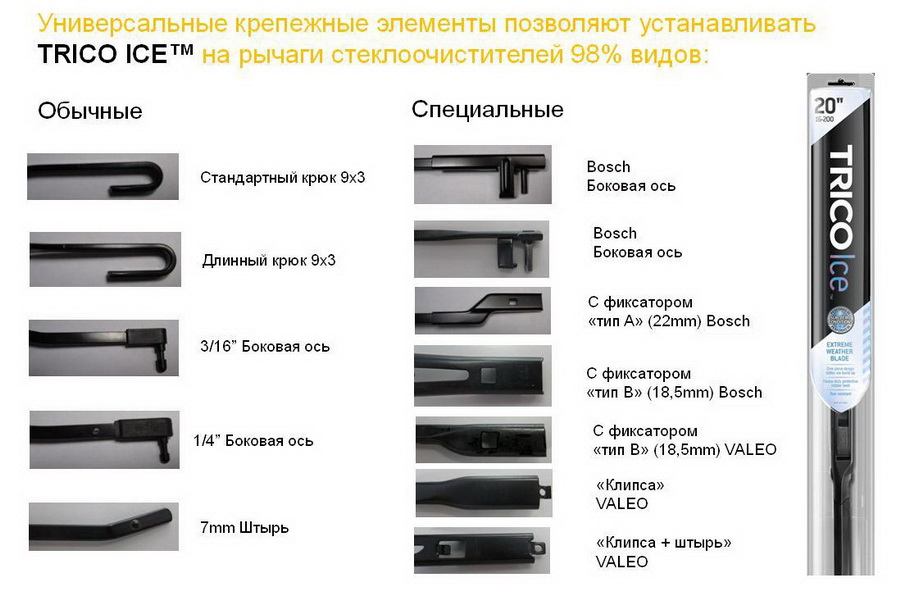 Trico Ice 600 — это бескаркасная зимняя щетка стеклоочистителя с усиленной конструкцией. Длина стеклоочистителя Trico составляет 60 см. Стеклоочиститель Trico Ice 600 оснащен мультиадаптером и поэтому легко устанавливается на автомобиль любой марки со следующим креплением: