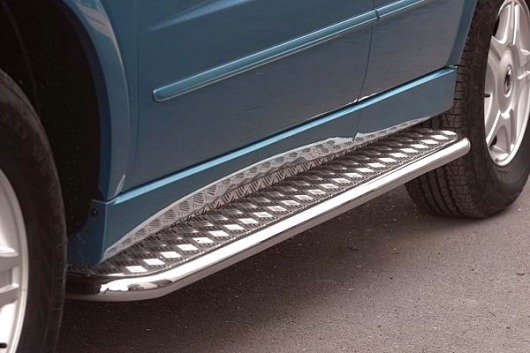 Пороги на SsangYong Kyron – это боковые подножки из нержавеющей стали диаметром 42 мм, которые позволяют более комфортно входить и выходить из салона автомобиля. Подножки SsangYong Kyron очень прочные, надежные и долговечные: они не боятся коррозии, сколов и царапин и выдерживают большие нагрузки.