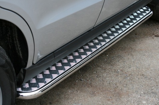 Боковые пороги-подножки сделаны специально для автомобилей Hyundai Santa Fe 2010-2012 г.в., поэтому устанавливаются достаточно просто и без повреждений корпуса. Помимо этого, стальные пороги с листом для Хендай Санта Фе смотрятся очень стильно и эффектно. Они добавят вашему авто еще больше солидности и внушительности.