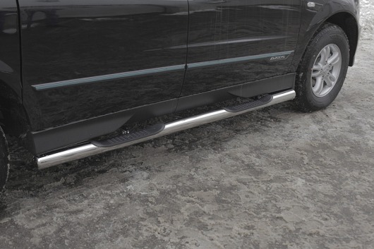 Пороги на SsangYong Actyon Sport – это боковые подножки из нержавеющей стали диаметром 76 мм, которые позволяют более комфортно входить и выходить из салона автомобиля. Подножки SsangYong Actyon Sport очень прочные, надежные и долговечные: они не боятся коррозии, сколов и царапин и выдерживают большие нагрузки.