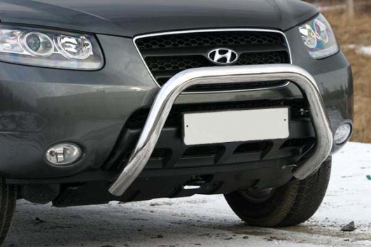 Передняя решетка Hyundai Santa Fe (кенгурятник) – это защитная дуга на бампер из нержавеющей стали диаметром 76 мм.