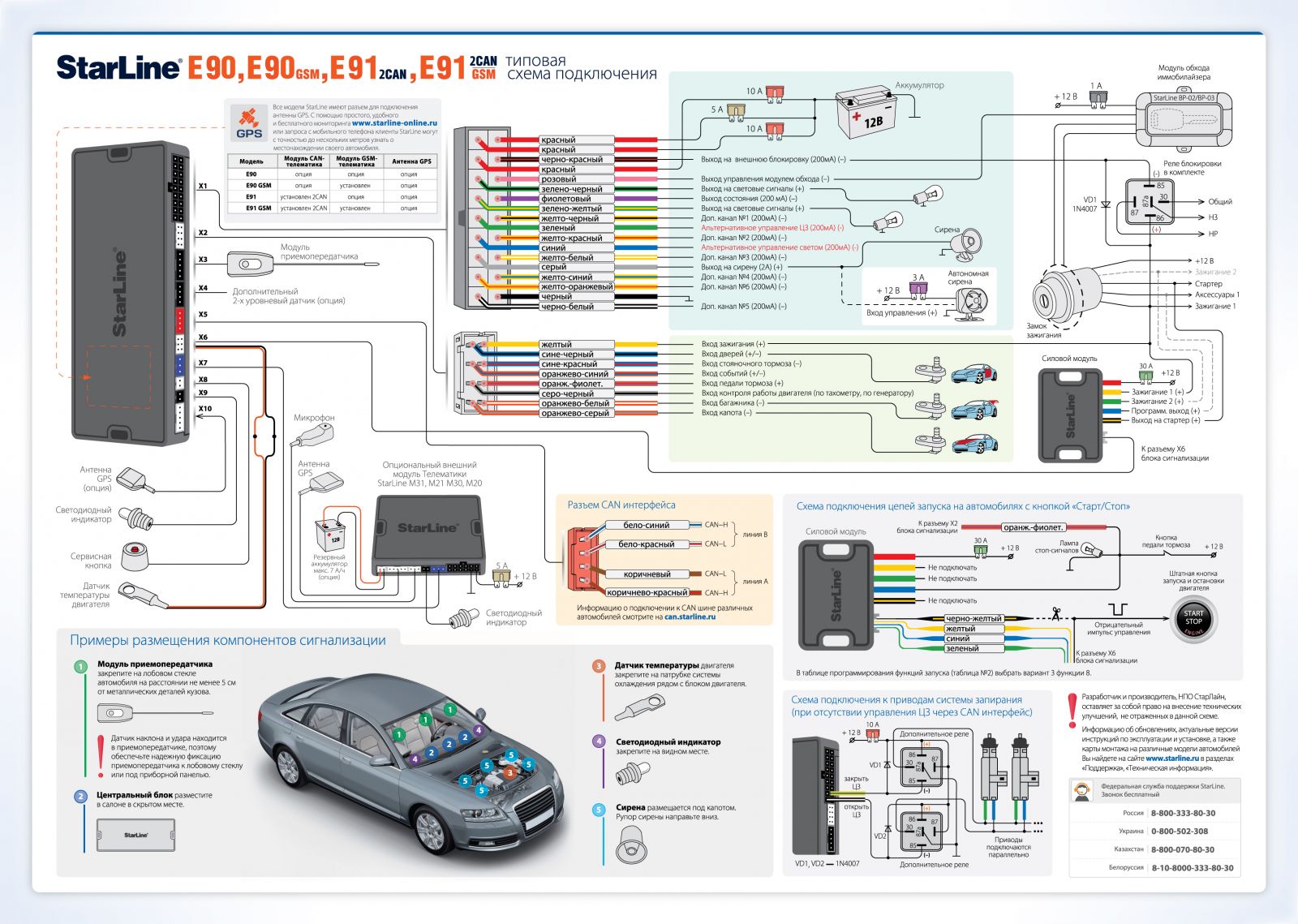 Скачать типовую схему подключения Starline E90 GSM.