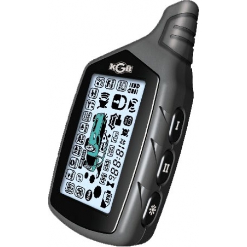 В состав KGB FX-3 ver.2 входит брелок с тремя кнопками, который работает по курсорному принципу выбора режимов. Основной брелок оснащен информативным жидкокристаллическим дисплеем. Помимо своих основных функций, брелок имеет некоторые специальные опции - часы, будильник и таймер. Дальность связи основного брелока с системой составляет приблизительно 600 метров, причем дальность работы на прием сообщений - до 1200 метров. Для надежной работы сигнализации, брелок оснащен ручной и автоматической функцией проверки нахождения в зоне связи. Помимо основного брелока, в комплект поставки входит дополнительный четырехкнопочный брелок с односторонней связью.