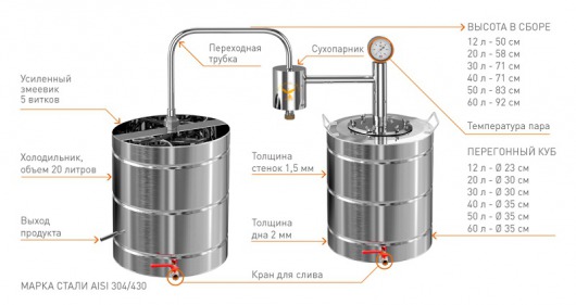 С помощью этого самогонного аппарата большой вместимости с сухопарником и баком на 70 литров вы легко сможете приготовить качественные спиртные напитки в любых условиях, например, на даче или в деревне. Этот аппарат не обязательно подключать к водопроводу: для охлаждения змеевика в нем предусмотрен дополнительный резервуар, который заполняется холодной водой. При этом вам не придется осваивать сложные технологии самогоноварения: достаточно просто залить в бак брагу и поставить аппарат на плиту (подойдет как газовая, так и электрическая плита) или на костер (почему бы и нет?).