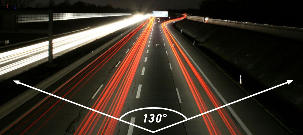 Широкий угол обзора. Автомобильный регистратор с углом обзора 130° охватывает 5 дорожных полос. При этом он не искажает картинку, как большинство широкоугольных видеорегистраторов.