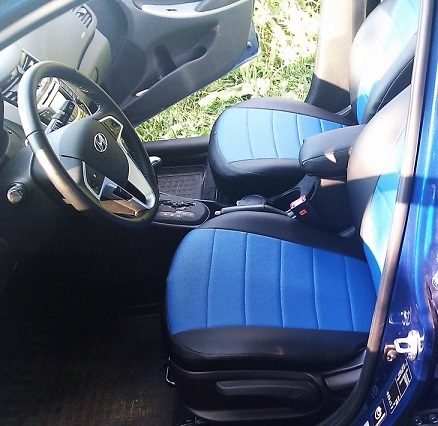 Вопросы и отзывы про Чехлы автомобильные для Hyundai Solaris, хэтчбек, от 10 г.в. (черно-синие, экокожа)