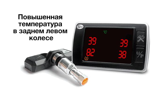 • Оповещение звуковым и световым сигналами. Когда давление и температура одного из колес выходит за установленные вами пределы, система предупреждает вас звуковым сигналом, а также подсвечивает цифру проблемного колеса на экране.