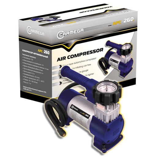 Поршневой компрессор Carmega APC-260 — отличный выбор для владельцев легковых машин. Давления в 10 атмосфер при производительности 25 л/мин. с избытком хватает для накачивания шин любых легковых типов и размеров, в том числе используемых на кроссоверах. Автокомпрессор Carmega APC-260 крайне удобен в эксплуатации: кабель питания длиной 3 м и почти метровый шланг позволят накачать все колеса автомобиля, не меняя места подключения, а обрезиненная рукоять упрощает переноску устройства.