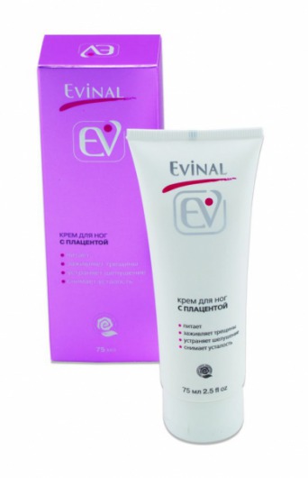 Крем для ног с экстрактом плаценты (Evinal) снимает усталость и ощущение тяжести в ногах, обладает сильным смягчающим эффектом, тонизирует кожу ног, предупреждая появление шелушения, заживляет мелкие трещины и замедляет процессы старения. Предназначен для ежедневного ухода за кожей ног.
