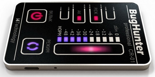 Ультратонкий обнаружитель шпионского оборудования профессионального класса BugHunter CR-1 "Карточка" своими формой и размером напоминает банковскую карту.  Детектор жучков работает в широчайшем диапазоне частот — от 10 до 3500 МГц и имеет стабильно высокую чувствительность. Расширенный динамический диапазон 70 Дб позволяет все известные радиоустройства, применяемые для шпионажа (жучки, радиомикрофоны, мобильные телефоны, беспроводные камеры).