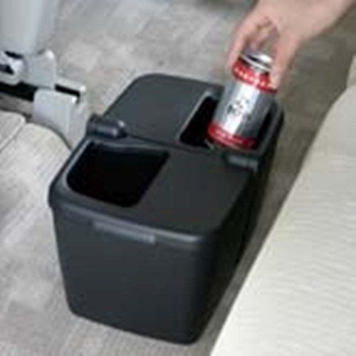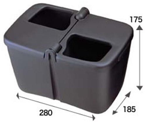 Контейнер для мусора FIZZ-845 изготовлен из черного прочного пластика. Для того, чтобы контейнер не переворачивался, в его дне установлен утяжелитель. Приспособление состоит из двух боксов, каждый из которых имеет крышку с отверстием для мусора. Размеры контейнера всего 275х170х160 мм, однако, этого вполне достаточно для хранения мусора между остановками.