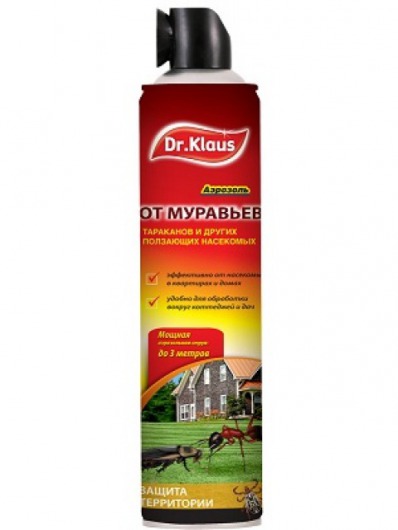 Аэрозоль Dr. Klaus — это универсальное средство для защиты вашего дома от муравьев, тараканов, клопов, блох и других нелетающих насекомых. Взвешенные в воздухе частички действующих веществ, входящих в состав препарата, моментально воздействуют на нервную систему насекомых и убивают их. Причем, средство эффективно защищает от насекомых в течение нескольких месяцев после обработки. А для людей и домашних животных концентрация инсектицидов не представляет никакой опасности (кроме аллергиков и больных бронхиальной астмой). Это средство идеально подходит для обработки от насекомых загородных домов и квартир.