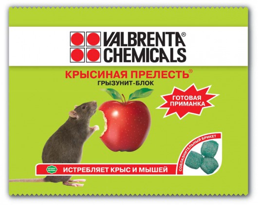 Готовая приманка для грызунов VALBRENTA CHEMICALS ГРЫЗУНИТ БЛОК с удобной дозировкой — это доступное и надежное средство для борьбы с мышами и крысами в местах обитания с высокой влажностью (подвалы, сараи, гаражи). Аппетитные твердые брикеты с ароматом яблока отвечают пищевым предпочтениям грызунов, так что ни одна крыса или мышь не устоит перед таким "угощением". Но достаточно будет "угоститься" один раз, и доза отравляющего вещества окажется смертельной.