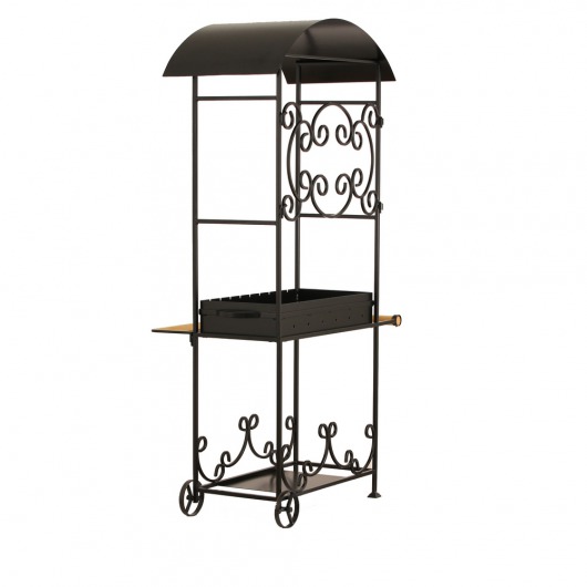 • За счет двух небольших стальных колес намного легче будет передвигать металлический мангал с крышей с места на место. Тем более, что для этого есть удобная деревянная ручка.
