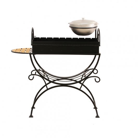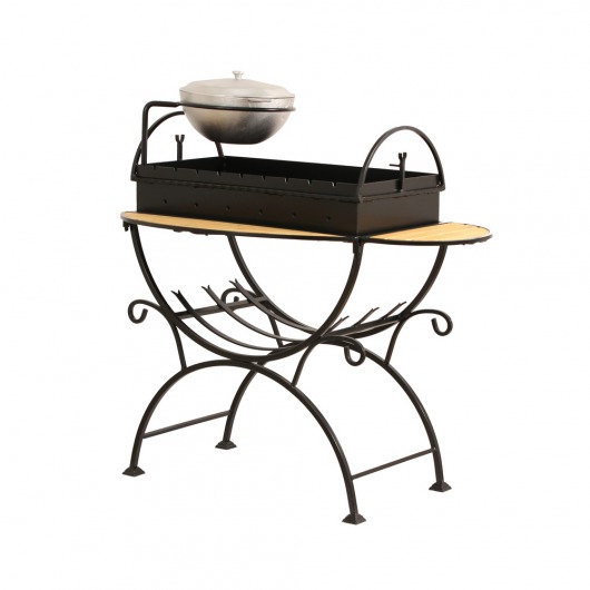 И это не единственные преимущества дачного кованого мангала МСК. Несмотря на изящность и компактность, его конструкция отличается особой прочностью. Стойка усилена элементами ручной ковки, а ящик мангала изготовлен из цельного листа жаростойкой стали толщиной 2 мм на гидравлическом прессе. Такая жаровня выдерживает высокие температурные нагрузки в течение долгого времени и не деформируется. А спереди и сбоку жаровни расположились 2 удобных деревянных столика (один из них съемный), которые можно использовать как подставки для посуды или вместо разделочных досок. В комплекте с мангалом вы также получите казан на 5 литров. В нем можно готовить плов или разогревать уже готовый шашлык.