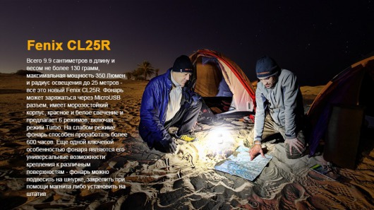 Фонарь Fenix CL25R пополнил серию кемпинговых устройств производства компании Fenix. Именно его назначение и определило основные характеристики этого фонаря. Прежде всего, он производит мягкий рассеянный свет, который не ослепляет и позволяет свободно ориентироваться на территории диаметром 25 м. Для небольшой компании, которая отдыхает за городом с палатками, одного такого фонаря будет достаточно, чтобы осветить территорию всего лагеря. В больших же кемпингах лучше использовать сразу несколько фонарей.