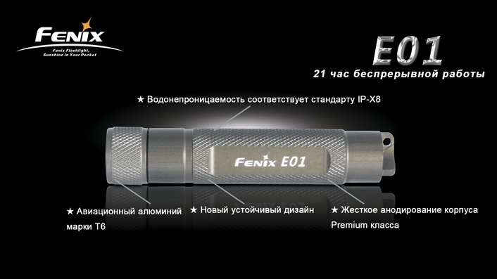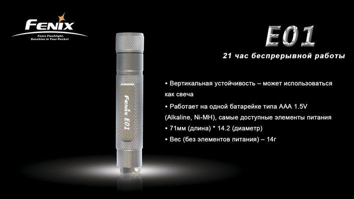 Главным преимуществом Fenix E01, которое выделяют производители, является его экономный расход энергии. От 1 заряда аккумулятора устройство способно проработать 21 ч без перерывов.