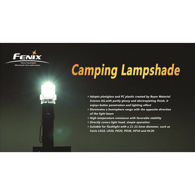 Благодаря выпуклой форме, рассеиватель-насадка Fenix Camping Lampshade дает мягкий свет, расходящийся во все стороны от фонаря. Эту диффузионную линзу удобно использовать для чтения, рассматривания туристических карт и просто освещения пространства внутри палатки и вокруг нее. Модель Fenix Camping Lampshade совместима с любыми фонарями Fenix с диаметром головной части 21-22,5 мм. В из числе Fenix LD10, LD12, LD20, LD22, и другие фонари.