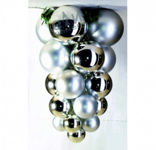 Гроздь из шаров серебристого цвета будет очень выгодно смотреться во время праздничных дней. Вы можете разместить ее на новогодней елке или развесить по дому как элемент интерьера.