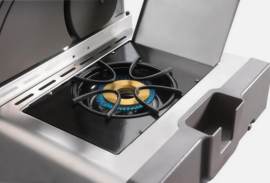В комплектацию входит: основной корпус гриля с крышкой из нержавейки, две стальные решетки для готовки (основная и для томления продуктов), семь основных горелок и три вспомогательных, боковые столы, две выдвижные полки в основном корпусе, фиксируемые колеса, встроенный термометр.