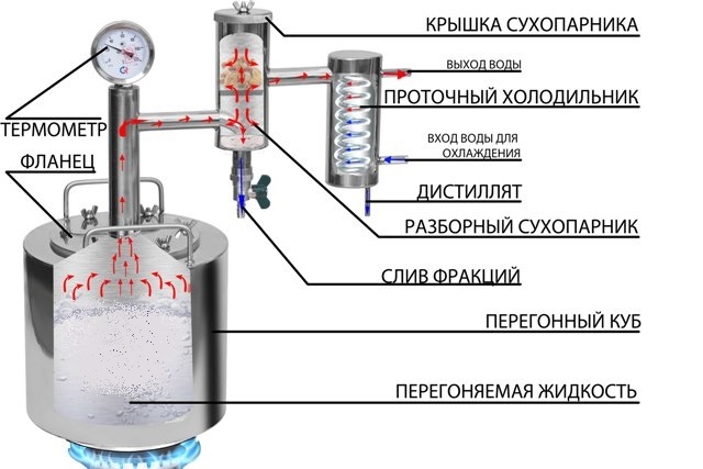 Разборный сухопарник позволяет не только отсекать часть вредных примесей в процессе дистилляции, а также ароматизировать получаемый напиток непосредственно в процессе перегонки.