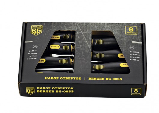 BERGER BG-08SS — это универсальный набор из 8-ти отверток с крестовыми наконечниками РН (Phillips) и прямыми наконечниками SLOT (шлиц). Отвертки изготовлены их прочной никель-хром-молибденовой стали марки AISI 8660, благодаря чему инструменты выдерживают продолжительные интенсивные нагрузки. А удобные резиновые рукоятки не скользят и абсолютно не деформируются при использовании.