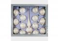 Шар на елку серебряно-белый со стразами сделан из стекла. В набор входит 12 елочных шаров, каждый по 8 см в диаметре.