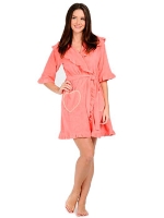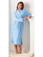 Халат средней длины чуть выше колена. Длина рукава - 1/2, широкий однотонный пояс, внутренние завязки для дополнительной фиксации.