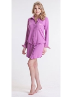 Свободный силуэт, застежка - пуговицы, рукав 3/4, широкий манжет, длина - чуть выше колена. Халат полностью выполнен из шелковой цветной ткани с однотонной отделкой воротника, манжета рукава и передней планочки.