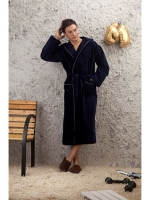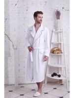 Воротник - шаль в стиле мужского костюма, широкий манжет. По всей длине полов халата, воротника и на карманах - стильная и лаконичная отделка темно-серым, декоративным кантом. Гипоаллергенный материал, обладающий антибактериальными свойствами. Прекрасно впитывает влагу.